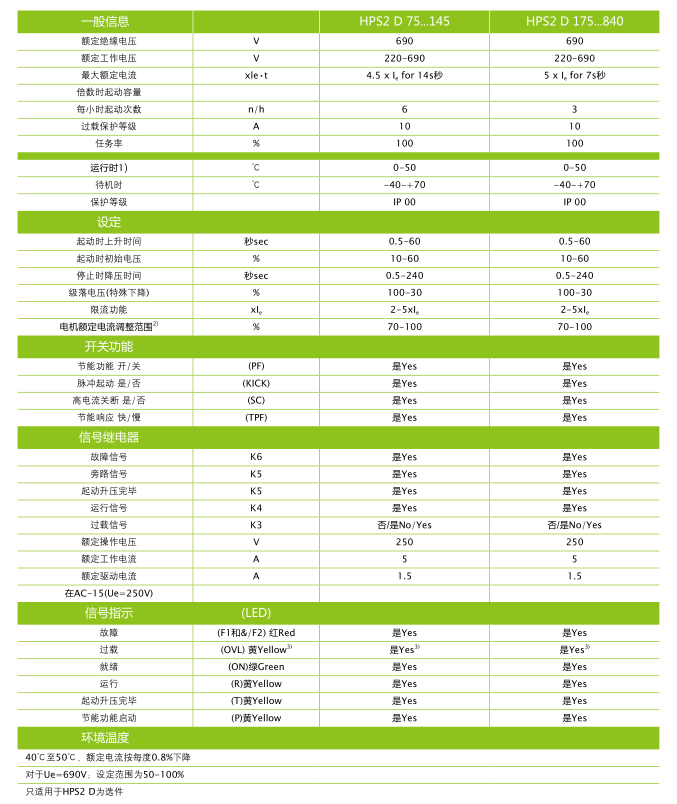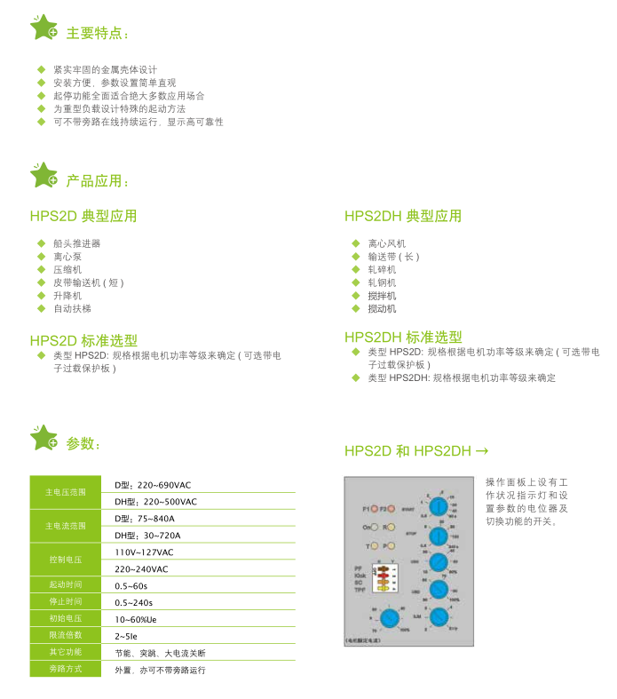 HPS2D75...840HPS2DH30...720 軟起動器均有著堅固的金屬殼體設(shè)計,可分別適用于常規(guī)負(fù)載和重型負(fù)載的各種應(yīng)用場合它結(jié)構(gòu)牢固緊湊,安裝方便快捷。所有參數(shù)和功能選項(xiàng)均通過前面板上的調(diào)節(jié)電位器和功能切換開關(guān)來設(shè)定和選擇。直觀清晰,各工作階段和狀態(tài)及故障均有相應(yīng)LED 指示讓用戶一目了然。特設(shè)節(jié)能功能,當(dāng)電機(jī)運(yùn)行在空載或輕載時自動降低負(fù)載電壓,
