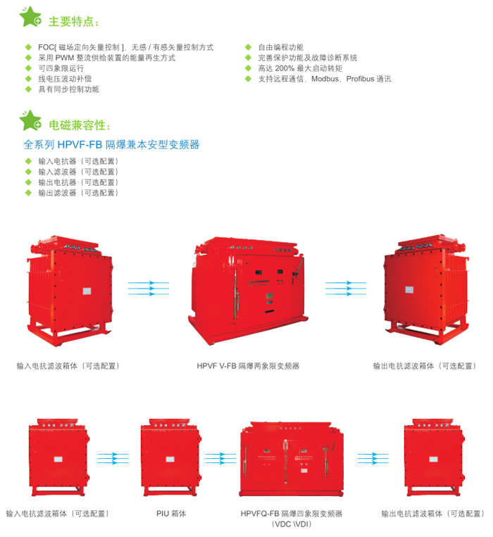 HPVF-FB隔爆兼本安型變頻器以全新的設(shè)計思路,將變頻、矢量控制、隔爆及本質(zhì)安全等技術(shù)相結(jié)合,具有多種控制模式、低速高轉(zhuǎn)矩等特性,可四象限運行,具有能量回饋功能,節(jié)能效果明顯。主要適用于煤礦井下或露天礦山、選煤廠等有爆炸危險場所的大負(fù)荷設(shè)備軟起動、軟停車控制。