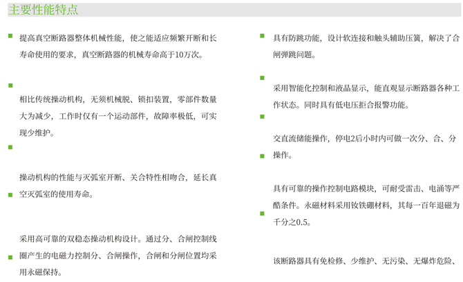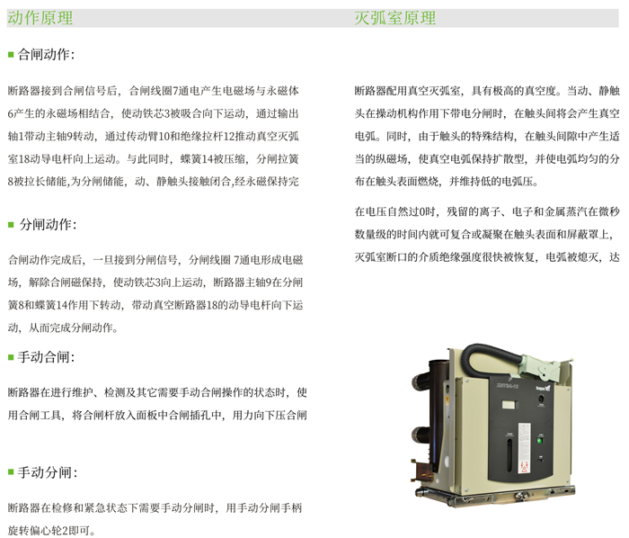 永磁操動機構是一種用于高壓真空斷路器永磁保持、電磁控制的操動機構,是一種全新的工作原理和結構。與傳統(tǒng)操動機構相比較,具有主要部件少,是傳統(tǒng)斷路器操動機構零部件的7%,無需機械脫扣鎖扣裝置,故障點少,可靠性高,使用壽命長,其中永磁操動機構壽命可達10萬次以上,適于頻繁操作及高可靠變電站等場所的應用。永磁機構克服了傳統(tǒng)彈簧機構和電磁機構的不足,同時通過永磁材料實現(xiàn)真空斷路器分、合閘位置的保持及操作過程,從而達到高可靠性和頻繁操作以及惡劣環(huán)境場所的穩(wěn)定的操作。